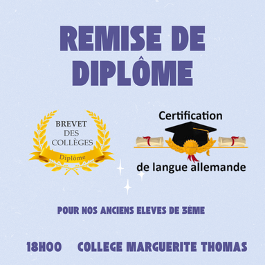 Par VALERIE BOUYSSOU, publié le mardi 25 novembre 2025 10:54 - Mis à jour le mardi 25 novembre 2025 10:54Vendredi 28 novembre 2025, à 18h00, le collège procèdera à la cérémonie de remise des diplômes DNB et CFG et certifications en langue allemande. -